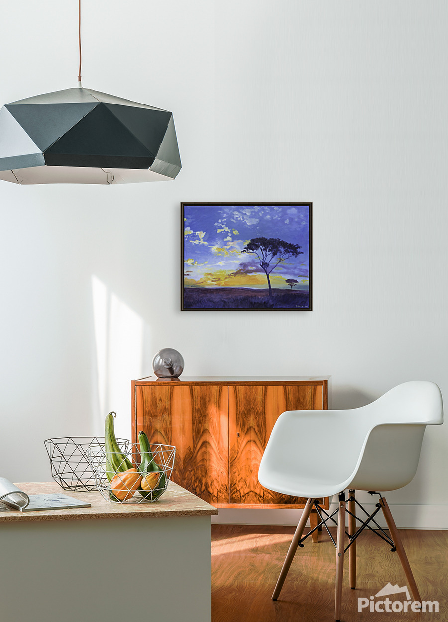 This is oil on canvas, framed with a simple black frame, ready to hang.
